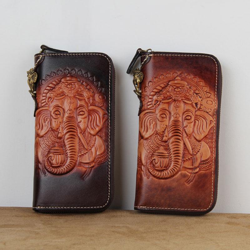 Handmade Leather Ganesha Tooled Mens Long Wallet Cool Leather Wallet Clutch Wallet for Men