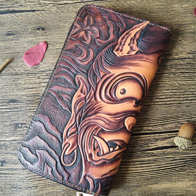 Handmade Leather Buddha&Demon Tooled Mens Long Wallet Cool Leather Wallet Clutch Wallet for Men