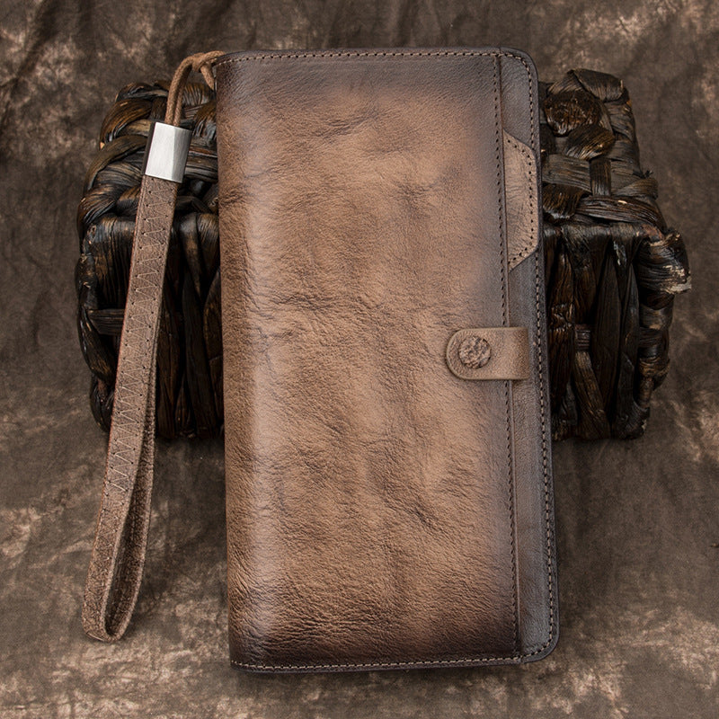 Mens Bifold Wallet Leather Brown Zip Long Lots of Cards Wallet Wristlet Wallet For Men
