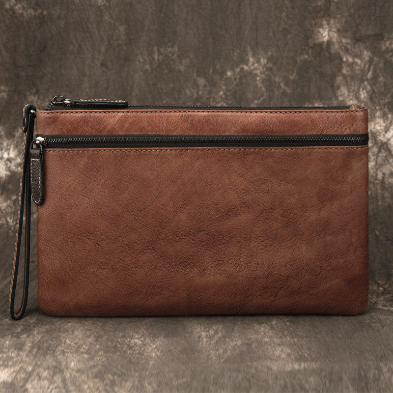 Vintage Brown Leather Men's Clutch Bag Double Zipped Small Wristlet Handbag Storage Bag For Men