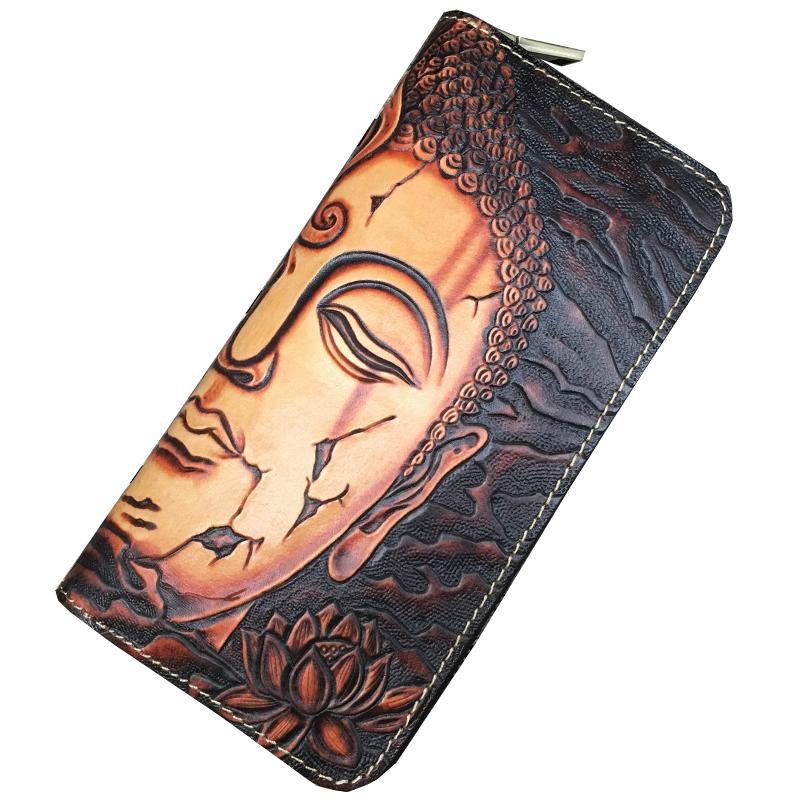 Style: Black Handmade Buddha Leather Long Wallet Zipper Wallet Clutch Wallet For Men