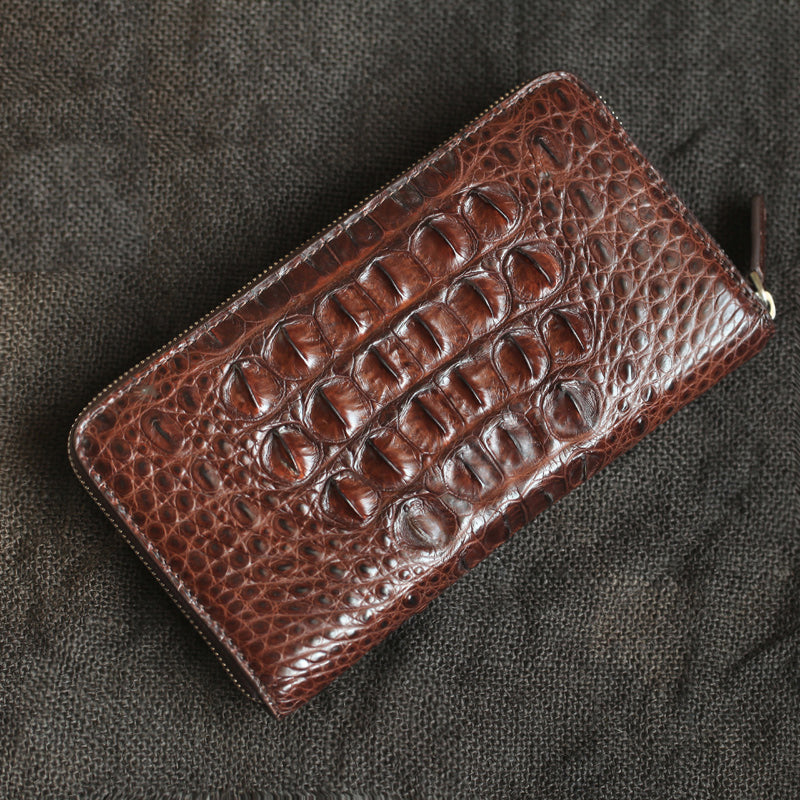 Brown Crocodile Leather Mens Black Zipper Bifold Long Wallet Black Clutch Wallet For Men – uleather