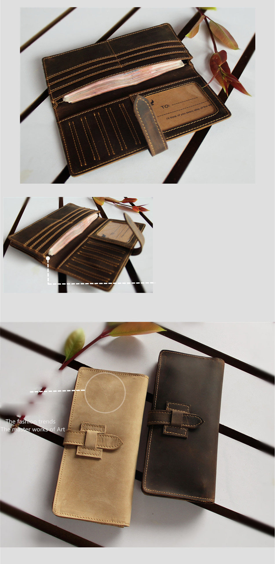 Style: Dark Brown Handmade Leather Mens Bifold Beige Long Wallet Card Wallet For Men