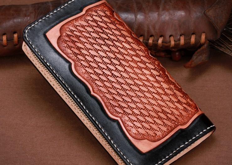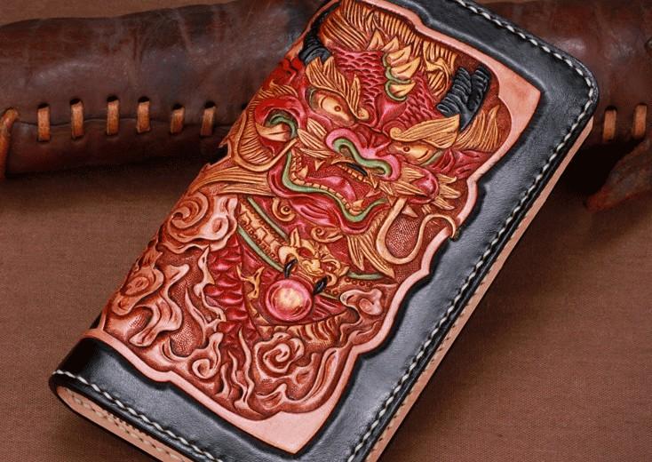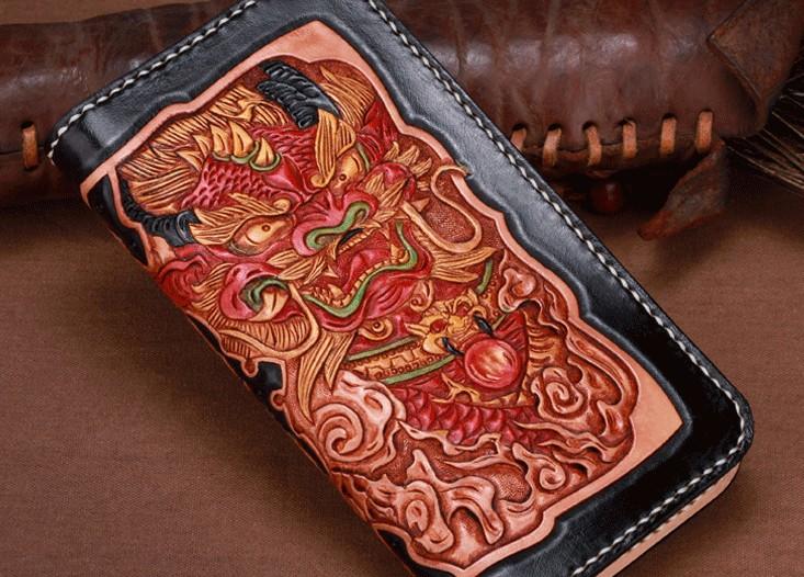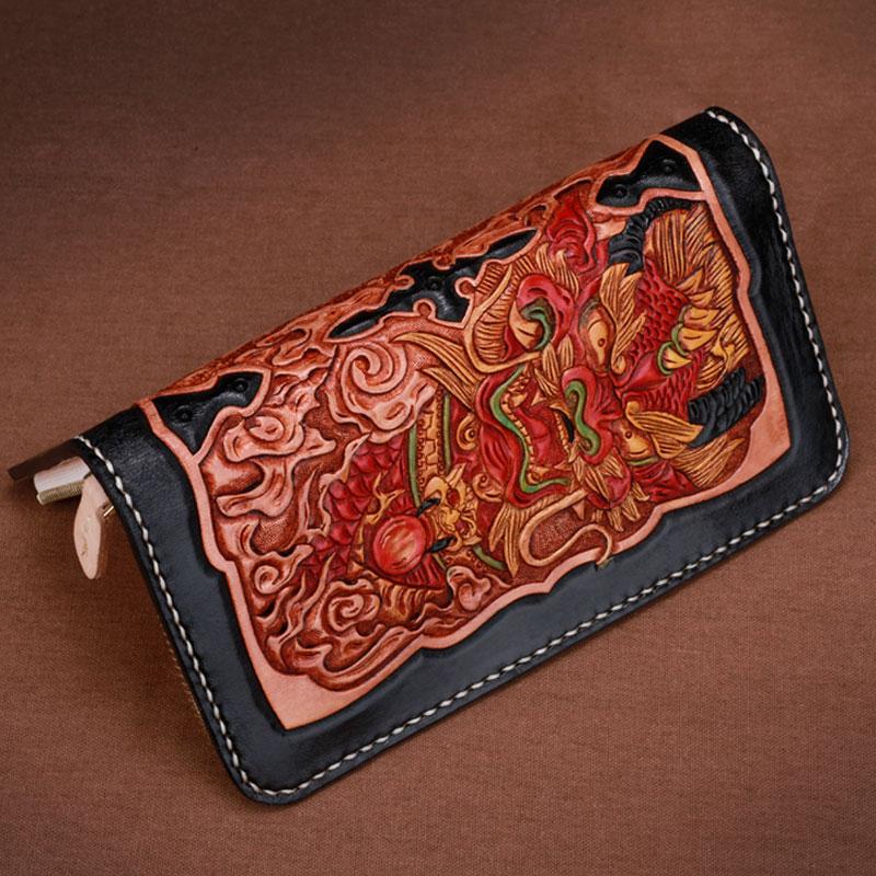 Handmade Leather Mens Clutch Wallet Cool Kylin Tooled Wallet Long Zipper Wallets for Men – uleather