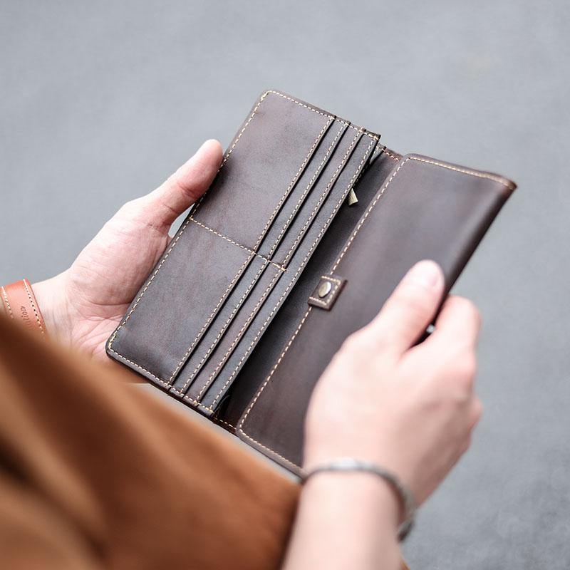 Style: Retro Dark Brown Leather Mens Trifold Long Wallet Multi-cards Long Wallet For Men